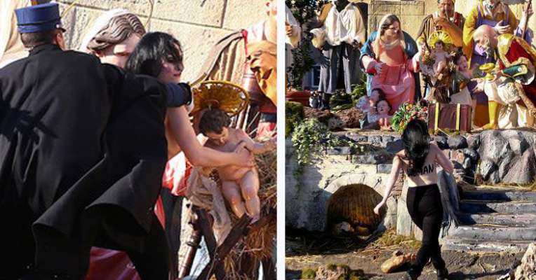 സെന്റ് പീറ്റേഴ്സ് സ്ക്വയറില് ഗാര്ഡനില് ഒരുക്കിയ ക്രിസ്തുമസ് രൂപക്കൂടിലേയ്ക്ക് അതിക്രമിച്ചു കയറി ഉണ്ണി യേശുവിനെ മോഷ്ടിക്കാന് ശ്രമിക്കുകയായിരുന്നു യുവതി. ദൈവം സ്ത്രീയാണ് എന്ന മുദ്രാവാക്യം അവരുടെ മുതുകില് എഴുതിയിരുന്നു. അര്ധനഗ്നയായാണ് യുവതി രൂപത്തിന്റെ അടുത്തേയ്ക്ക് ഓടിയത്.