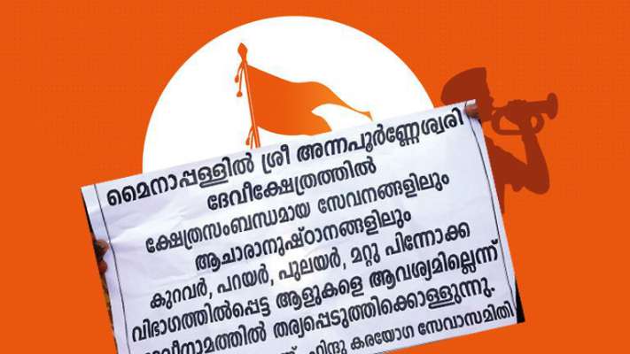 പത്തനംതിട്ട : പന്തളം മൈനാപ്പള്ളി അന്നപൂര്േണശ്വരി ക്ഷേത്രത്തില് അവര്ണ ഹിന്ദുക്കള്ക്ക് വിലക്കേര്പ്പെടുത്തി നാട്ടില് വ്യാപകമായി പോസ്റ്റര് നോട്ടീസ് പ്രചാരണം നടത്തിയത് വിവാദമാകുന്നു. ക്ഷേത്രത്തിലെ സേവനങ്ങള്ക്കും ആചാരാനുഷ്ഠാനങ്ങളിലും ഇനി മുതല് കുറവര്, പുലയര്, പറയര് സമുദായങ്ങളില്പെട്ടവരെ ആവശ്യമില്ലെന്ന് ‘ദേവീനാമത്തില് തെര്യപ്പെടുത്തിക്കൊള്ളുന്നു’ എന്ന് ഹിന്ദുകരയോഗസേവാസമിതി എന്ന പേരില് അറിയിച്ചാണ് നോട്ടീസ് പ്രചരിക്കുന്നത്.