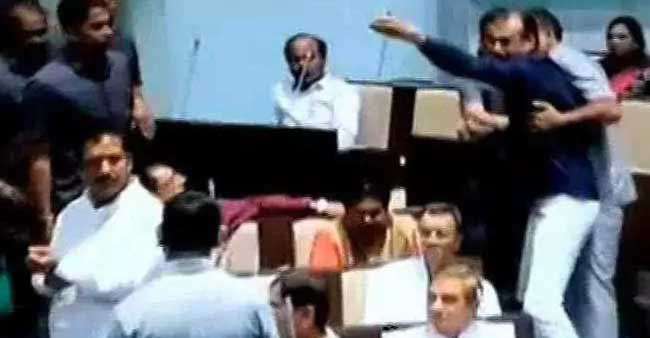 ബിജെപി അംഗമായ ജഗദീഷ് പാഞ്ചലിന്‍റെ മൈക്ക് പ്രതാപ് ദുദാത്ത് തല്ലിത്തകര്‍ത്തു. കോണ്‍ഗ്രസ് എംഎല്‍എ അമരീഷ് ദേറും ബിജെപി അംഗങ്ങള്‍ക്കുനേരെ ആക്രമണം നടത്തി. സംഭവത്തെ തുടര്‍ന്ന് ബിജെപി എംഎല്‍എമാര്‍ സ്പീക്കര്‍ക്ക് പരാതി നല്‍കി. ഗാന്ധിനഗര്‍ എസ്പിയെ നിയമസഭയിലേക്ക് വിളിച്ചുവരുത്തിയിട്ടുണ്ട്.