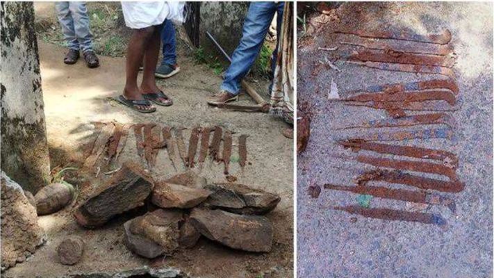 കലുങ്ക് വൃത്തിയാക്കാനെത്തിയ തൊഴിലാളികളാണ് ആയുധ ശേഖരം കണ്ടെത്തിയത്. ഇവര് വിവരം പോലീസിനെ അറിയിക്കുകയായിരുന്നു. നേരത്തെ ഈ മേഖലയില് ചെറിയ രാഷ്ട്രീയ സംഘട്ടനങ്ങള് നിലനിന്നിരുന്നു. ഇതിെന്റ ഭാഗമായി ആരെങ്കിലും ആയുധങ്ങള് ഒളിപ്പിച്ച് വച്ചതാകാമെന്നാണ് പോലീസിന്റെ സംശയം. ആയുധങ്ങള് പോലീസ് കസ്റ്റഡിയിലെടുത്തു.