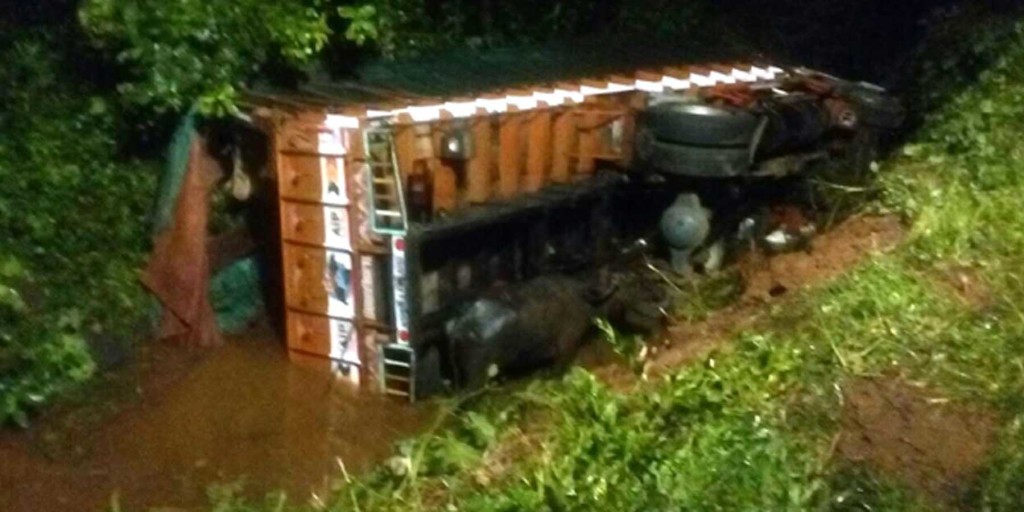 പുലര്ച്ചെ 2.10 ഓടെ കോരന്പീടിക അപകടവളവില് നന്മഠം ക്ഷേത്രത്തിന് മുന്നിലായിരുന്നു അപകടം. റോഡരികിലെ കാടുമൂടിക്കിടക്കുന്ന കൈവരികളില്ലാത്ത തോട്ടിലേക്കാണ് ലോറി മറിഞ്ഞത്. തെറിച്ചുവീണ പോത്തുകള് ലോറിക്കടിയില് കുടുങ്ങിയാണ് ചത്തത്. നാട്ടുകാര് വിവരമറിയിച്ചതിനെ തുടര്ന്ന് എത്തിയ ഹൈവേ പോലീസാണ് പരിക്കേറ്റ രാമസ്വാമിയെ മെഡിക്കല് കോളജിലെത്തിച്ചത്.