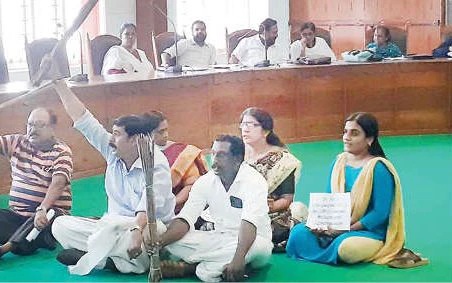 ഹാളിന്റെ നടുത്തളത്തില് ചൂട്ടുകറ്റയുയര്ത്തി ബി.ജെ.പിയുടെ ആറ് കൗണ്സിലര്മാര് കുത്തിയിരുന്നു.